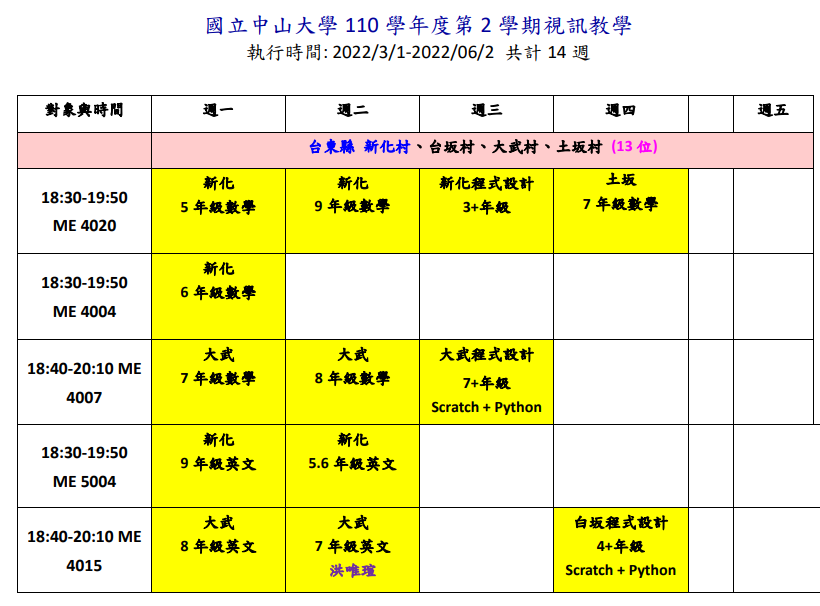 110學年度第1學期視訊教學計畫 台東縣 新化村、大武村、土坂村、森永村、大鳥村 (15位)